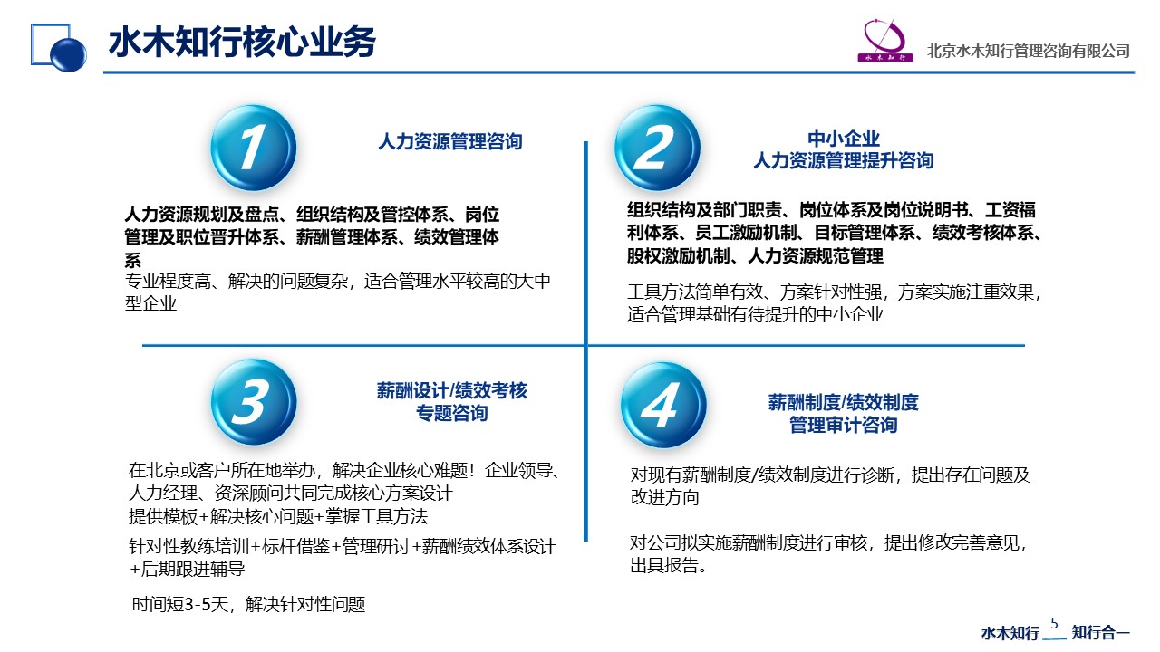 北京水木知行管理咨詢有限公司(www.bjsmzx_com.carpet1688.cn)專注提供人力資源管理咨詢、人力資源管理培訓、人力資源招聘咨詢、人力資源獵頭服務(wù)業(yè)務(wù);咨詢業(yè)務(wù)范圍包括組織結(jié)構(gòu)與管控體系、崗位管理體系、薪酬管理體系、績效管理體系,咨詢形式包括全過程咨詢、教練式咨詢和特訓班;培訓業(yè)務(wù)包括企業(yè)基礎(chǔ)管理...[詳情]